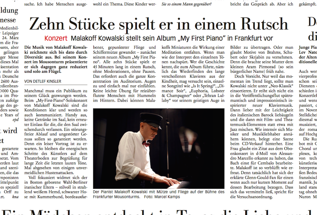 Samstag im Mousonturm, Frankfurt: „Poetische, minimalistische Klaviermusik, die an Etüden von Satie oder Debussy denken lässt. Es könnte aber auch ein Mahler-Zitat oder eine Bill-Evans-Kadenz zu vernehmen sein. Was Kowalski durchaus bewusst einsetzt. Wichtig sind ihm musikalische Pausen. Räume, in denen man versinken kann.“